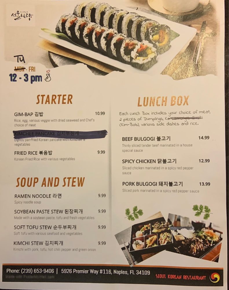 Seoul Korean Restaurant in Naples, FL, is a hidden gem offering a delightful Korean culinary experience. From the warm welcome to the diverse menu, every aspect exudes authenticity and charm. The delectable appetizers like Mandu dumplings and Tteokbokki showcase the rich flavors of Korean cuisine. The main dishes, from Bibimbap to Japchae noodles, are bursting with bold and savory tastes. The cozy ambience and attentive service make dining here a truly enjoyable affair. Seoul Korean Restaurant is a must-visit for those seeking a memorable dining adventure filled with fantastic food and welcoming vibes.